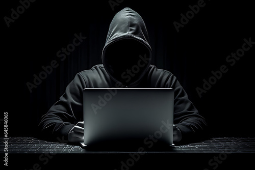 Anonymous hacker typing on laptop computer. Security hacking and cyber crime concept, dark black.