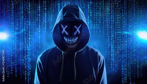 anonymous man, hacker wearing mask over dark background, streaming binary code in background