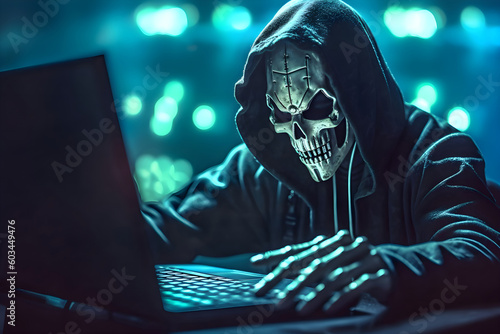 Anonymous robot hacker with skull mask typing computer laptop. Concept of hacking cybersecurity, cybercrime, cyberattack, etc.