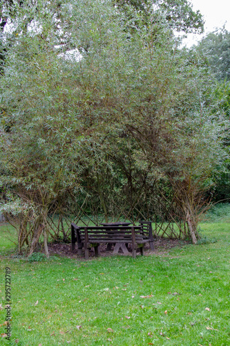 Ansicht einer Sitzgruppe unter einer Baumgruppe