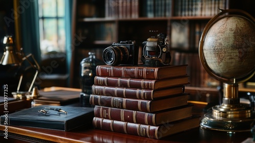 Antique Cameras Resting Upon A Stack Of Leather Bound Books