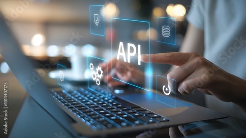 API: a businessman using a laptop with a hologram of API, virtual interface that hologram of API,API integration, API development, JSON, API documentation, Application prgramming interface