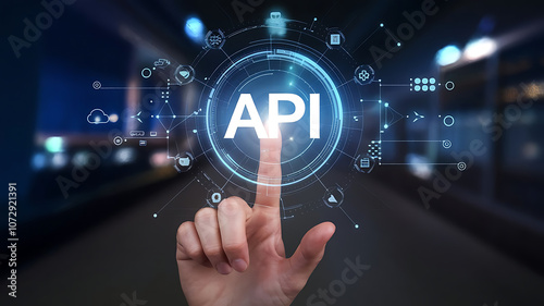 API application programming interface, a finger touch a hologram virtual interface that hologram of API, API integration, API development, JSON, API documentation,