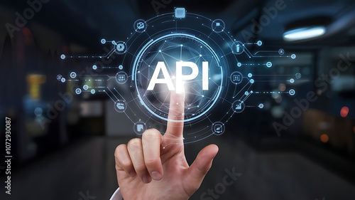 API application programming interface, a finger touch a hologram virtual interface that hologram of API, API integration, API development, JSON, API documentation,