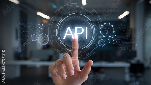 API application programming interface, a finger touch a hologram virtual interface that hologram of API, API integration, API development, JSON, API documentation,