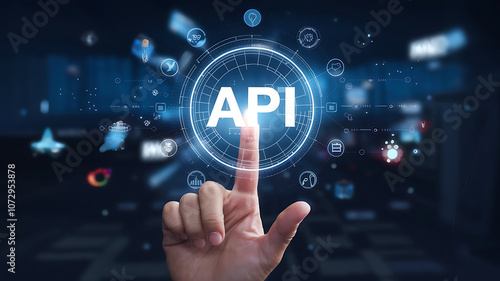 API application programming interface, a finger touch a hologram virtual interface that hologram of API, API integration, API development, JSON, API documentation,