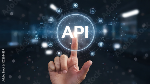 API application programming interface, a finger touch a hologram virtual interface that hologram of API, API integration, API development, JSON, API documentation,