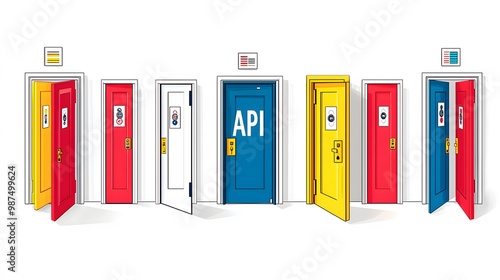 API Gateway: A gateway with multiple doors, each representing a different API endpoint. "API" ,isolate on white background
