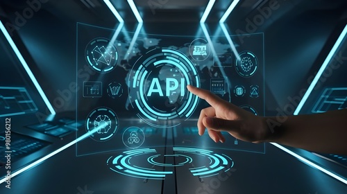 API, holographic interface displaying API icons, Application programming interface, Business technology, API integration,