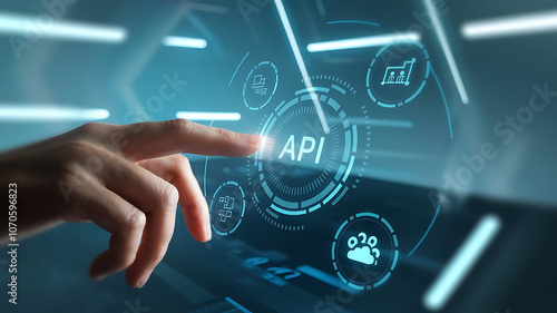 API interface, Application programming interface, Businessmen Interacting with a Futuristic API Interface, business technology, API integration
