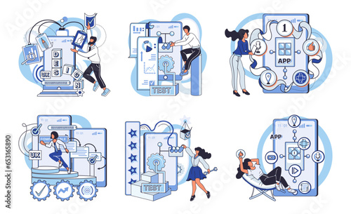 Application testing metaphor. Vector illustration. App test, test drive before app is out for spin in market Software testing, inspection officer ensuring coding standards are met Application testing