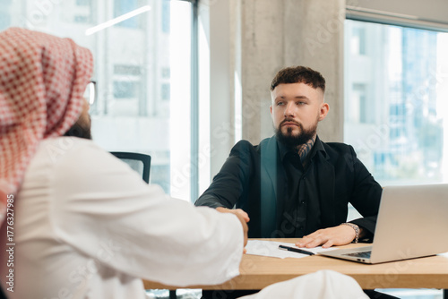 Arab businessman shaking hands with colleague in office