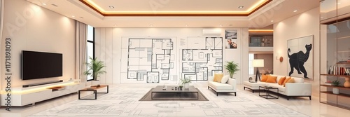 Architect meticulously drafting floor plan of luxury villa with spacious living areas, elegant interiors, sophisticated design, spacious, design