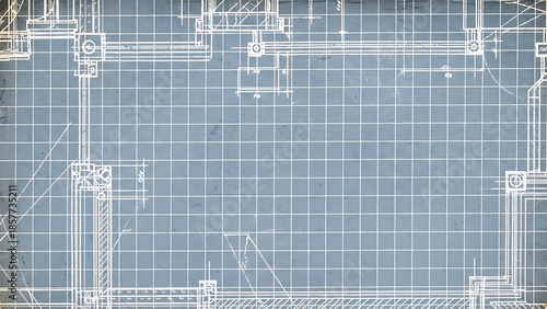 Architectural Blueprint with White Grid and Technical Line Drawings on Blue Background, Engineering Plan