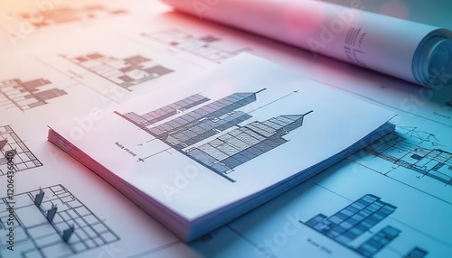 Architectural blueprints and designs studio workspace visual content creative environment overhead view planning concepts for building