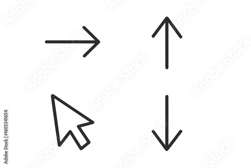 Arrow icon set. Black line style web icons. Up, down, right direction arrows. Computer mouse cursor pointer. UI UX design element. Navigation button for website, app.
