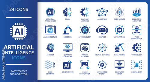 Artificial intelligence - Icon Collection. Thin Line Set contains such Icons as Ai Architecture, Brain, Robotics, Machine Learning, Ai Technology, Algorithm and more. Simple web icons set.