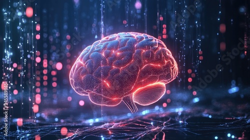 Artificial intelligence (AI) concept with a glowing brain and data streams