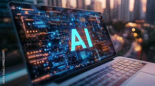 Artificial intelligence and digital technology. Person using AI with laptop at work. Creative content. Generate text or image. Command input on website. Bot assistant conversation.