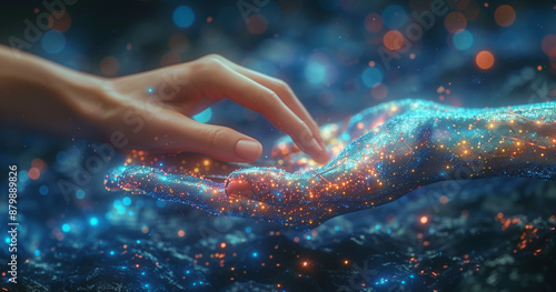 Artificial intelligence and human hand touching each other on a dark blue background