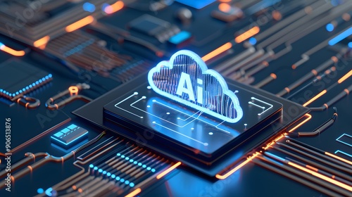 Artificial intelligence cloud technology concept with 3D icon on integrated circuit. Futuristic electronics and AI computing power close-up.