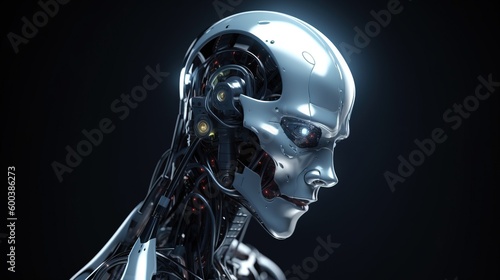 Artificial intelligence, composition of a chrome cyborg robot on a dark background, isolate. AI generated.
