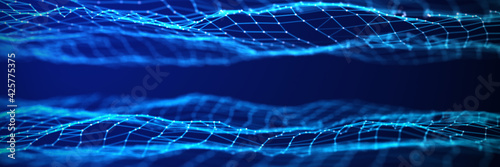 Artificial intelligence concept. Big data visualization. Blue cyber technology wave. 3d rendering.