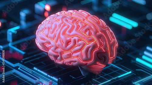 Artificial intelligence database and future computing concept. A glowing brain integrated with futuristic technology.
