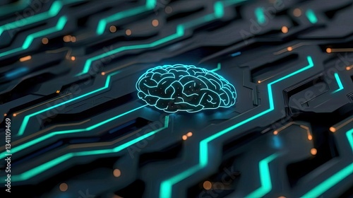 Artificial intelligence database and future computing concept. Futuristic brain design over a circuit pattern in blue light.