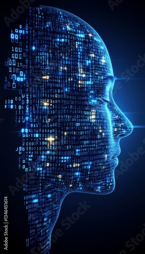 Artificial Intelligence. Digital human face built with glowing binary code on a dark background.