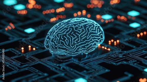Artificial intelligence future network and data science concept. Futuristic brain illustration with circuit patterns and lights.