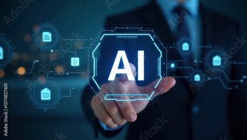 artificial intelligence generate text document and abstract papers. Man touching AI icon on electronic circuit board