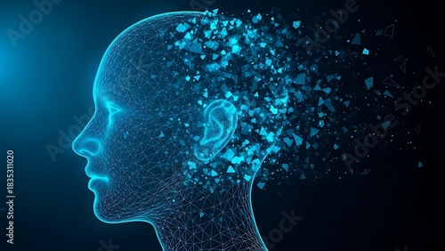 Artificial Intelligence Human Mind Concept With Digital Wireframe Head Dissolving Into Glowing Geometric Particles Representing Advanced Data Processing And Futuristic Technological Innovati
