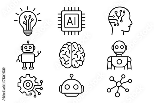 Artificial intelligence line icon set. AI concept, machine learning, robot, bot and brain. Innovation technology, deep learning, neural network, cyber, data science vector.
