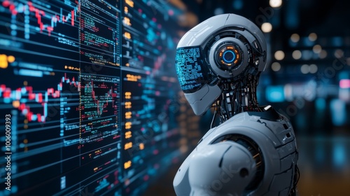 Artificial Intelligence Robot Analyzing Data on Large Screen