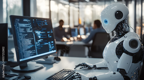Artificial intelligence robots working at computer in a modern office, data center. People and artificial intelligence futuristic robot working together in office. AI assistant business helper concept