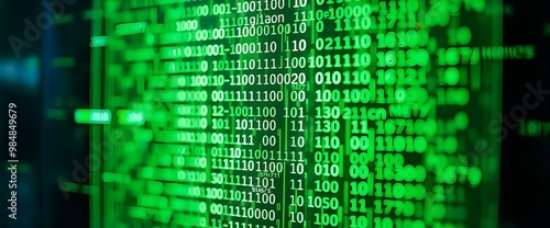 Artificial intelligence with a transparent screen displaying abstract binary code.