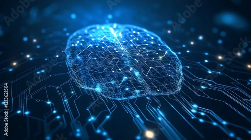 artificial mind interface, illuminated neural network, circular tech patterns, dark blue environment, circuit trace connections, hexagonal data structure, digital consciousness design, futuristic