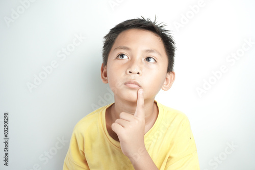 Asian boy with thinking expression isolated on white