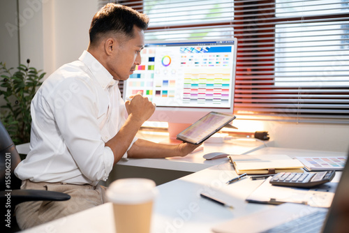 Asian man designer holding tablet looking at color chart and sitting with computer on working table.