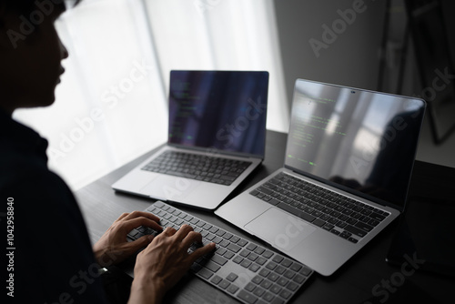 Asian man software engineer Working on Computer at office desk for writing program code IT Software Engineer finding errors tech support devops creating digital