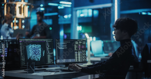 Asian Researcher Making a Quantum Computing Experiment, Monitoring Live Artificial Intelligence Data on Computer Screen, Running Software Code in Terminal Window. Developer Solving a Problem