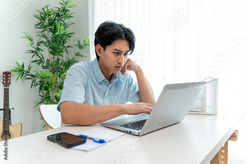 Asian stressed businessman typing on computer while working from home.