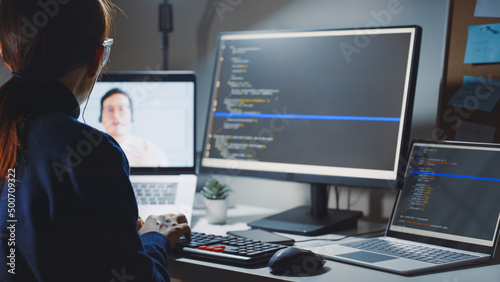Asian woman developer programmer, software engineer, IT technical support center talking with team via video call. Working on computer overtime to check coding in bugging system. Back view