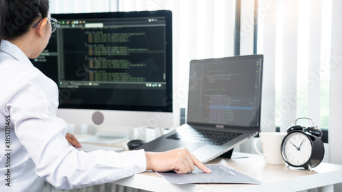 Asian Woman programmer typing source codes Programming On Computer in office, freelance web developer concept.
