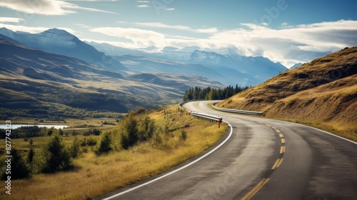 asphalt wavy mountain road green trees clouds vacation.