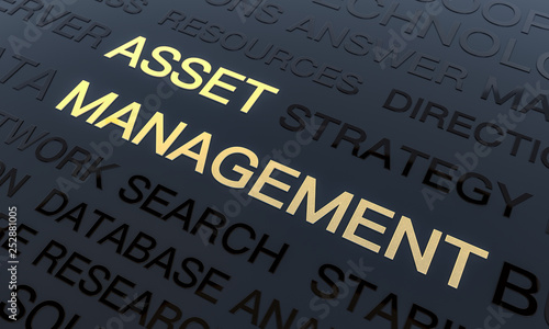 Asset Management Background, Word Cloud Concept In Black and Gold