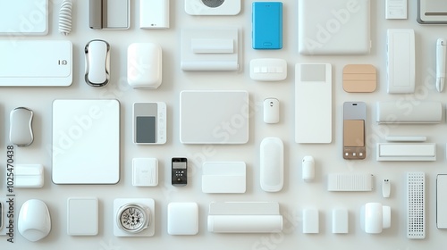 Assorted white tech gadgets and devices on an isolated background.