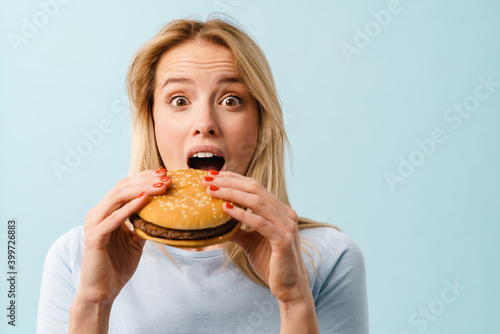 Astonished nice girl expressing surprise while posing with hamburger
