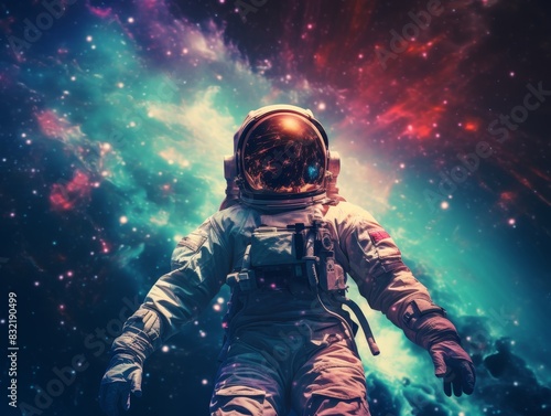 Astronaut floating in space with a vibrant nebula background, representing exploration, science, and the mystery of the universe.